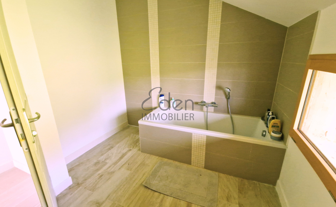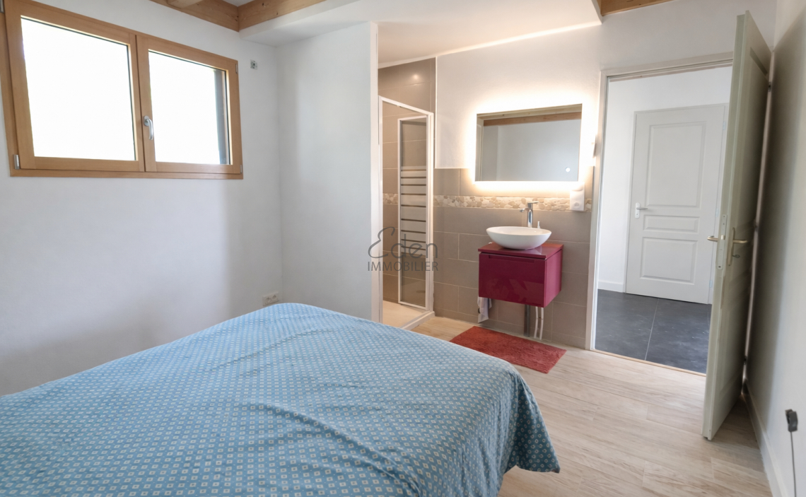 À l'étage, l'espace nuit se compose de deux chambres avec placards et balcons, d'une grande salle de bains, de WC séparés, ainsi que d'une suite parentale avec dressing, salle d'eau et balcon vu Mont Blanc.